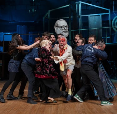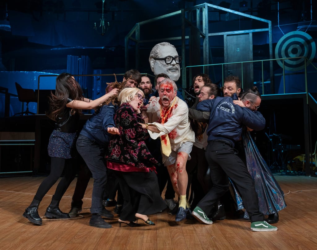 του παράσταση. Ο πατέρας, όμως, κινώντας ακόμη τα νήματα,τους«φορτώνει»για πρωταγωνιστή έναν εμπορικό ηθοποιό, σε κρίση ταυτότητας.Αυτή η συνάντηση,ψ«κουλτουριάρικου» και «εμπορικού»,γίνεται η αφορμή για να παρακολουθήσουμε όλα τα ευτράπελα που συνθέτουν τον λαμπερό κόσμο του θεάτρου μας. Παρασκηνιακές συνεννοήσεις, ακροάσεις, πρόβες, μέχρι και την ίδια την“πρεμιέρα”,παραγωγοί, σκηνοθέτες, κριτικοί, βοηθοί, αλλά και ένδοξα φαντάσματατου παρελθόντος, όλα μπλέκονται σε ένα φαρσικό πανδαιμόνιο μετά μουσικής.