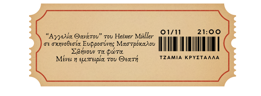 Παρακολουθήσαμε το Σάββατο 1.11.25 τη θεατρική παράσταση “Αγγελία Θανάτου” του Heiner Müller στο Θέατρο Τζάμια Κρύσταλλα στην περιοχή του Κεραμεικού σε Σκηνοθεσία- Δραματουργία της Ευφροσύνης Μαστρόκαλου.