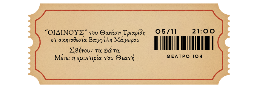 Στο θέατρο “104” της οδού Ευμολπιδών στο Γκάζι παρουσιάζεται για 2η χρονιά το έργο του Θανάση Τριαρίδη ο “Οιδίνους” (το έργο παιζόταν πέρσι στη σκηνή του Τεχνοχώρου Φάμπρικα)