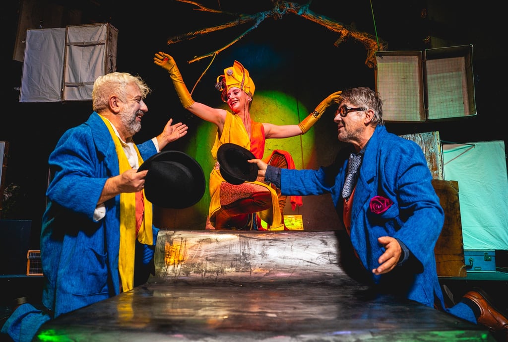 Η σκηνή γίνεται ένα θέατρο μέσα στο θέατρο, γεμάτο μπαούλα, βαλίτσες, ερείπια θεατρικών εποχών και φωτισμούς που δραπετεύουν από τον ρεαλισμό.